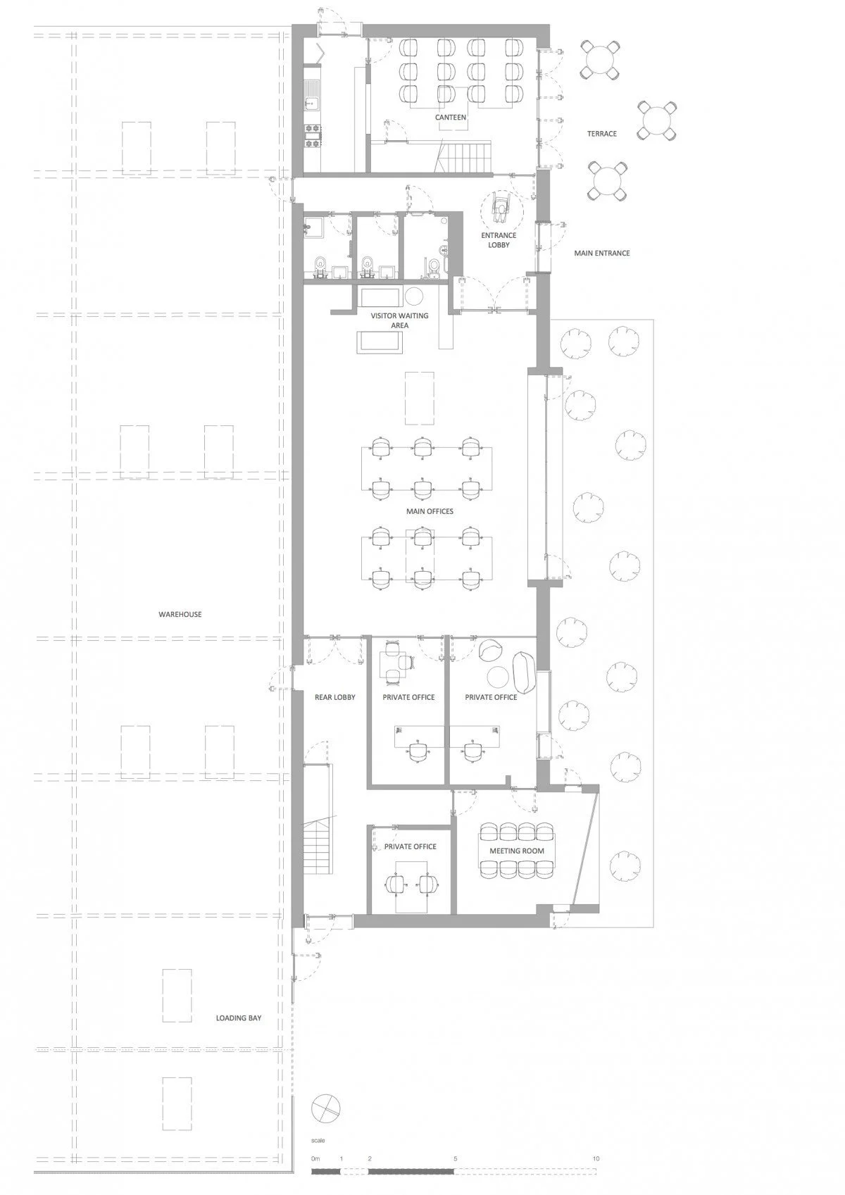Our Client approached us to carry out a feasibility study to add a new building in front of the existing warehouse, with access points between both buildings at ground floor level. The building, which has a northerly aspect, makes the most of this orientation for the internal working conditions, while the meeting room, the special space, faces towards the valley so its occupants can enjoy views.